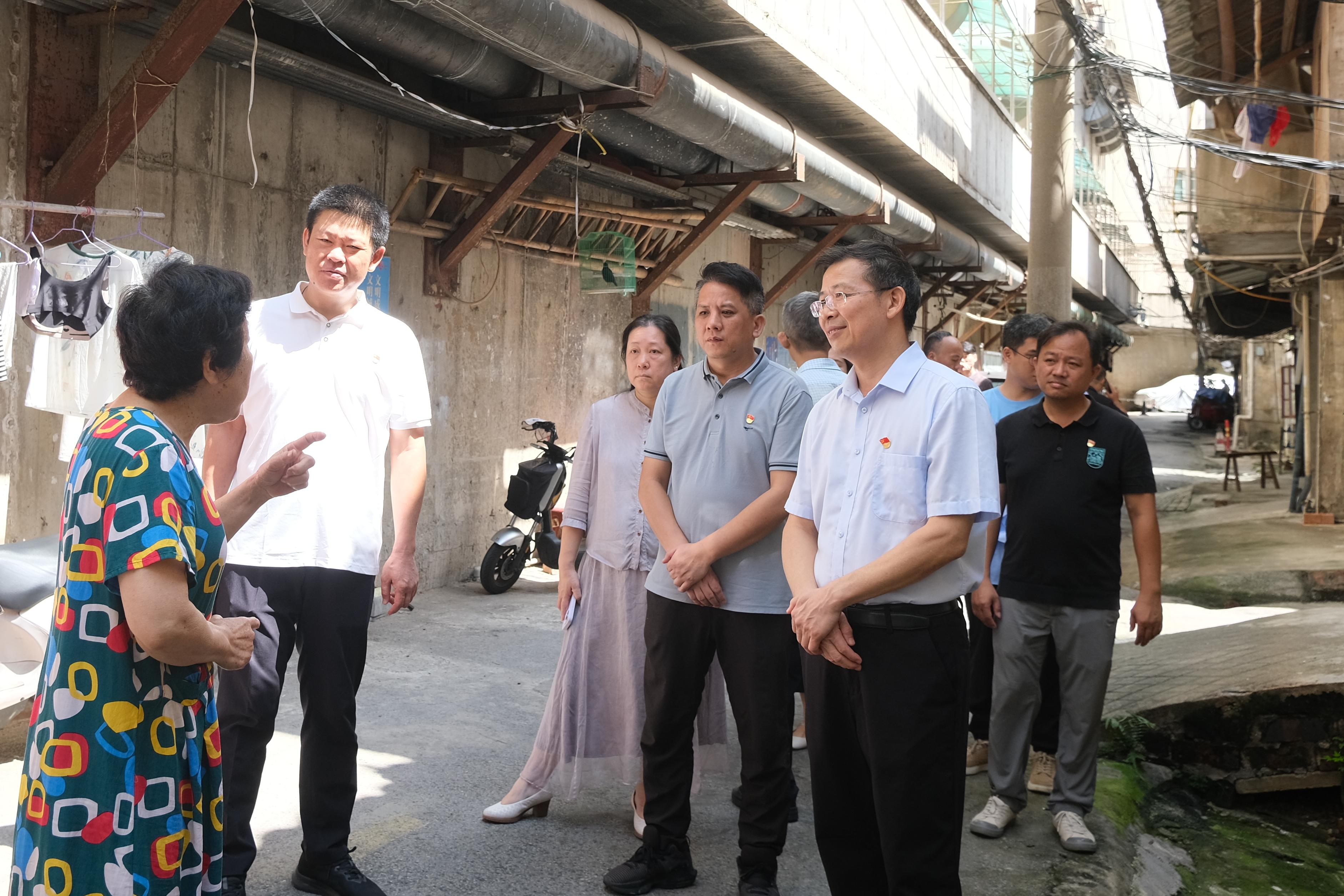南寧市住建局機關(guān)第六黨支部書(shū)記、公用事業(yè)三科科長(cháng)徐修平(左二)、南寧建寧水務(wù)集團黨委委員、副總經(jīng)理周柏建(左五),南寧市排水有限責任公司第一黨支部書(shū)記、副總經(jīng)理韋雄飛(左四)到中山東二里與社區居民進(jìn)行交流