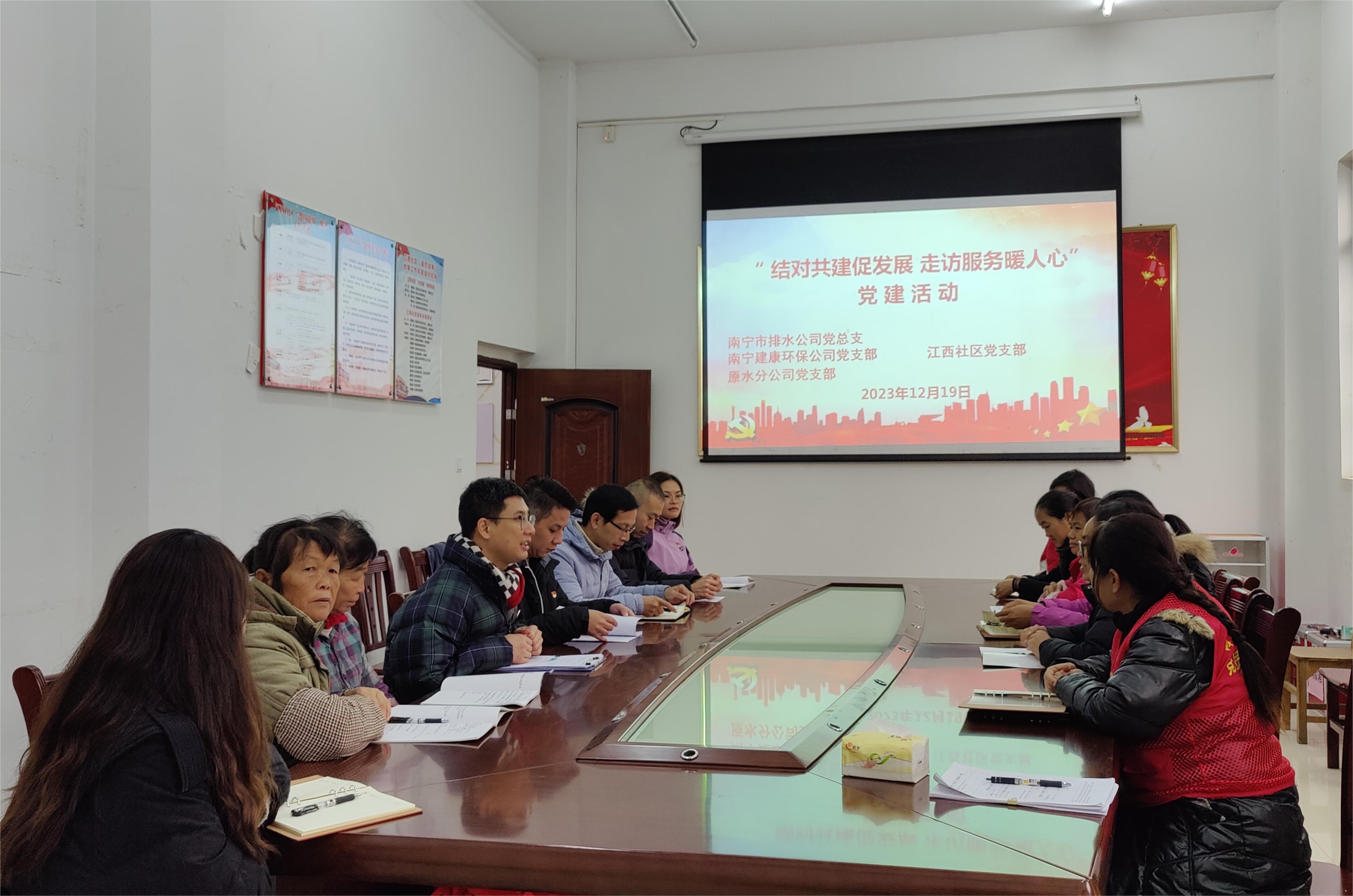 12月19日上午,市排水公司黨總支聯(lián)合集團公司原水分公司黨支部、南寧建康環(huán)保公司黨支部,前往黨組織聯(lián)系社區南寧市江南區江西鎮江西社區,開(kāi)展2023年在職黨員“走街巷、訪(fǎng)民情、促發(fā)展”活動(dòng)。