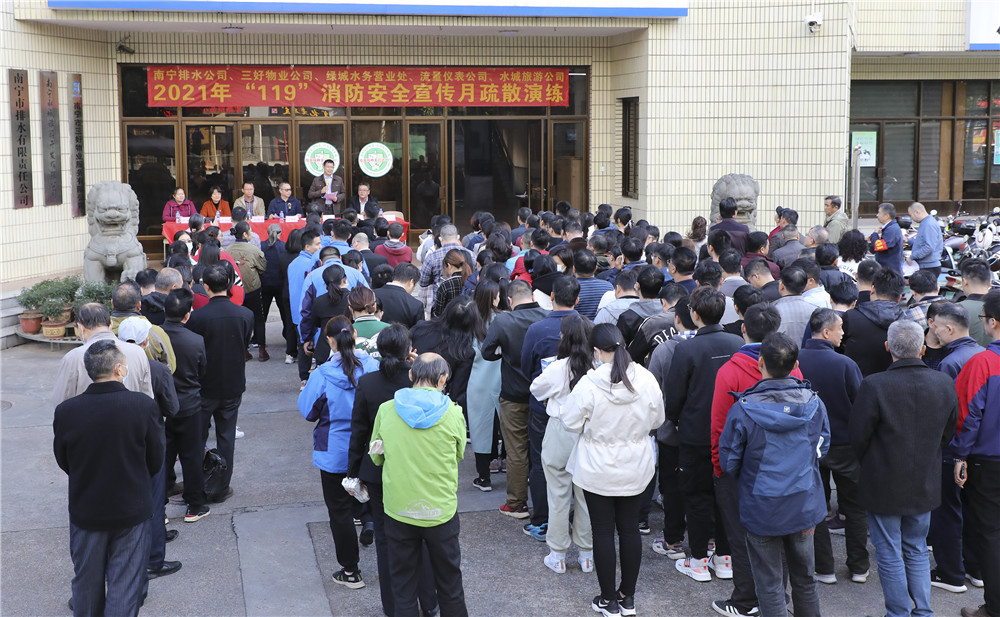 11月23日下午4時(shí),在南寧市江南區體育路4號辦公樓,隨著(zhù)集團公司副總經(jīng)理、排水公司董事長(cháng)周柏建的一聲“開(kāi)始”,2021年“119”消防安全宣傳月火災疏散應急演練活動(dòng)正式拉開(kāi)序幕。